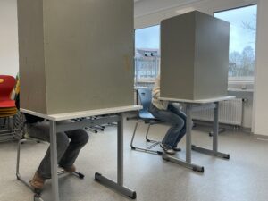 Am 24.02.2026 hatten unsere Schülerinnen und Schüler der Klassen IW11b und IW11c bei der U18-Wahl die Möglichkeit, sich über die Kommunalwahl zu informieren, diese zu simulieren und dabei demokratische Prinzipien einzuüben. Mitarbeiterinnen des Kreisjugendringes München Land funktionierten einen Klassenraum in ein vollfunktionsfähiges Wahllokal mit Stimmzetteln, Wahlkabinen und einer Wahlurne um. Nachdem sich die Schülerinnen und Schüler mit den Wahlmodalitäten vertraut gemacht hatten, setzten sie ihre Kreuze bei der Bürgermeister- und Landratswahl.